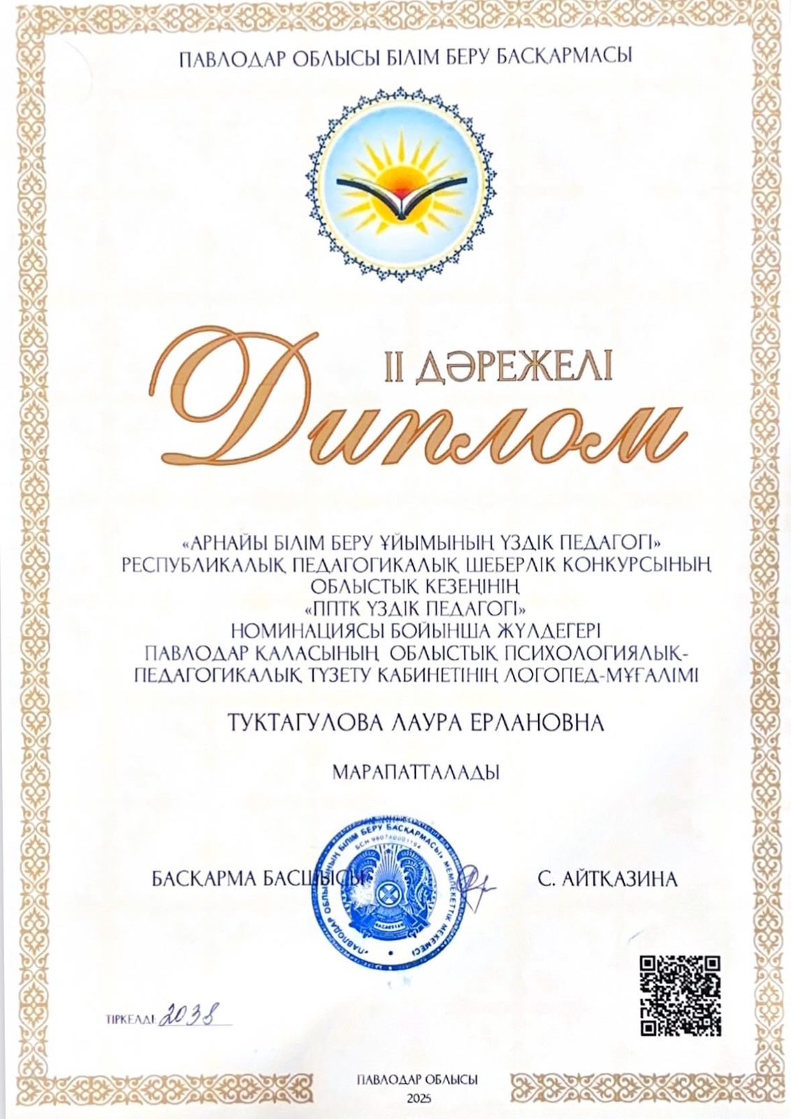 - 2 орын – Облыстық психологиялық-педагогикалық түзету кабинетінің логопед-мұғалімі Тұқтағұлова Л.Е.