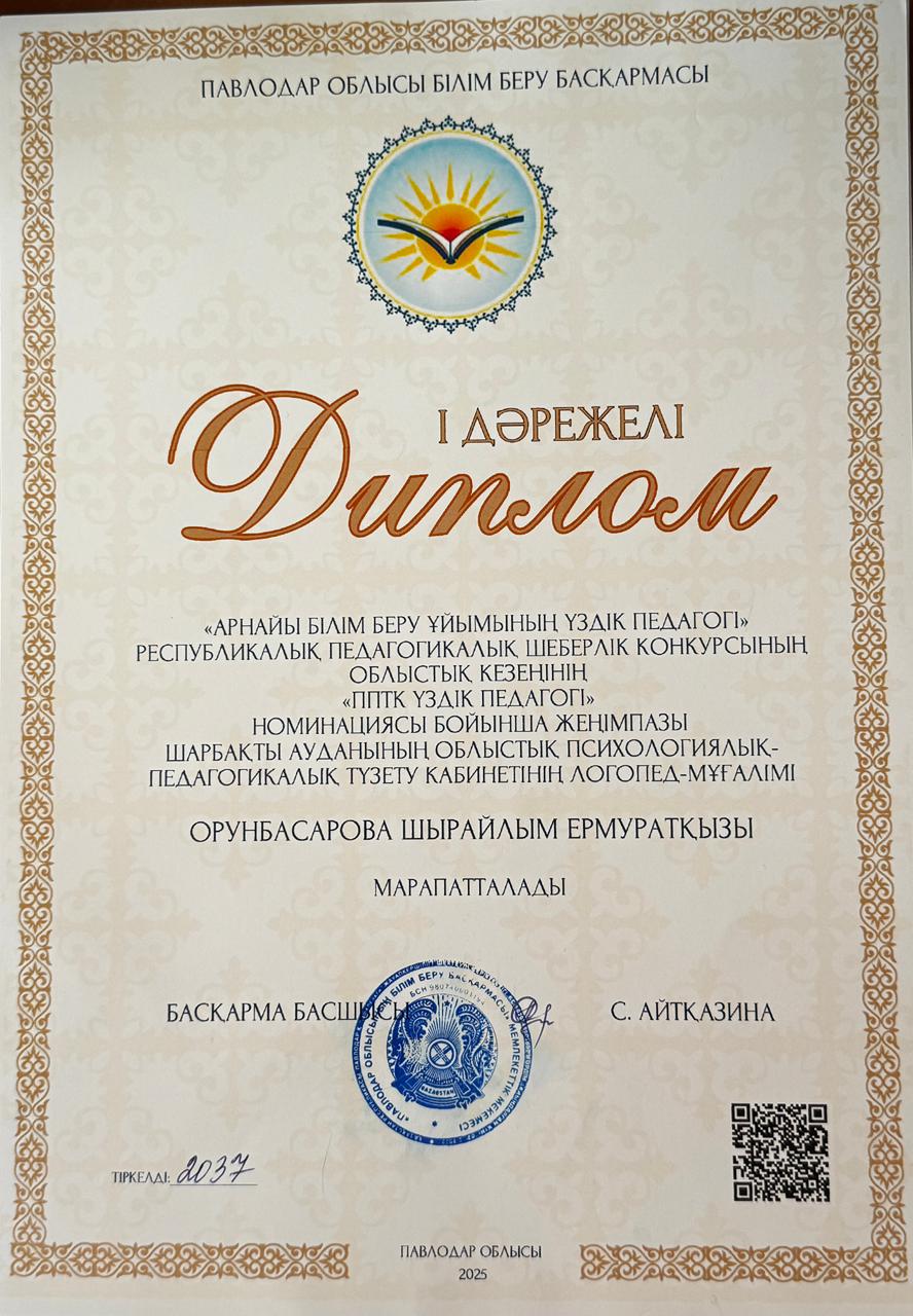 - 1 орын – Щербақты ауданы КППК логопед-мұғалімі Орынбасарова Ш.Е.